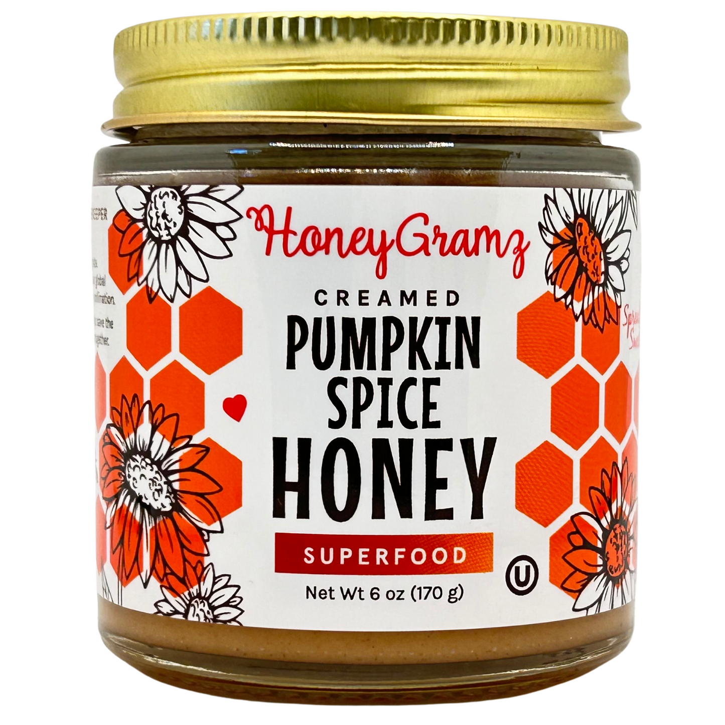 6 oz or 12 oz of 100% pure and raw Creamed New York Honey Infused with Pumpkin Spice which is actually Organic Cinnamon, Organic Ginger, Organic Nutmeg and Organic Clove.
